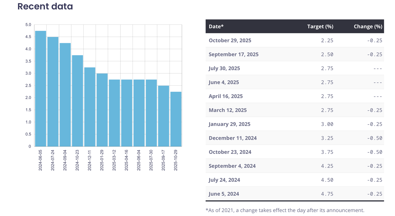 The next Bank of Canada rate announcement is scheduled for December 10th 📉. Current predictions suggest the overnight rate will hold steady at 2.25% through 2026, with very little movement expected over the next few announcements.The October rate cut didn’t create much of a shift in fixed-term mortgage rates, which are still sitting in the high 3% range for 3–5 year terms.If you’re wondering how this might affect your buying or selling plans — or just want to talk through what it means for you — I’m always happy to chat.