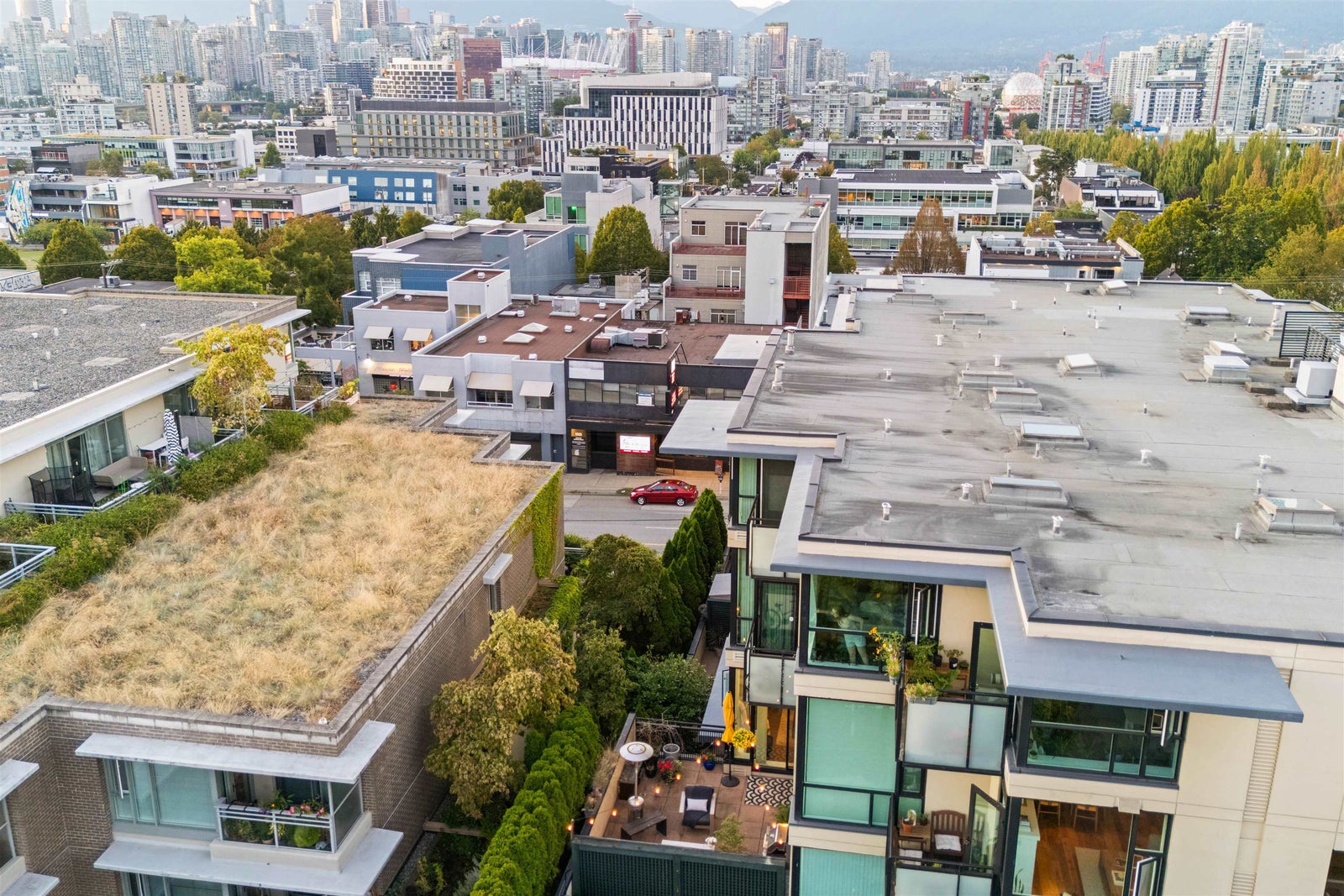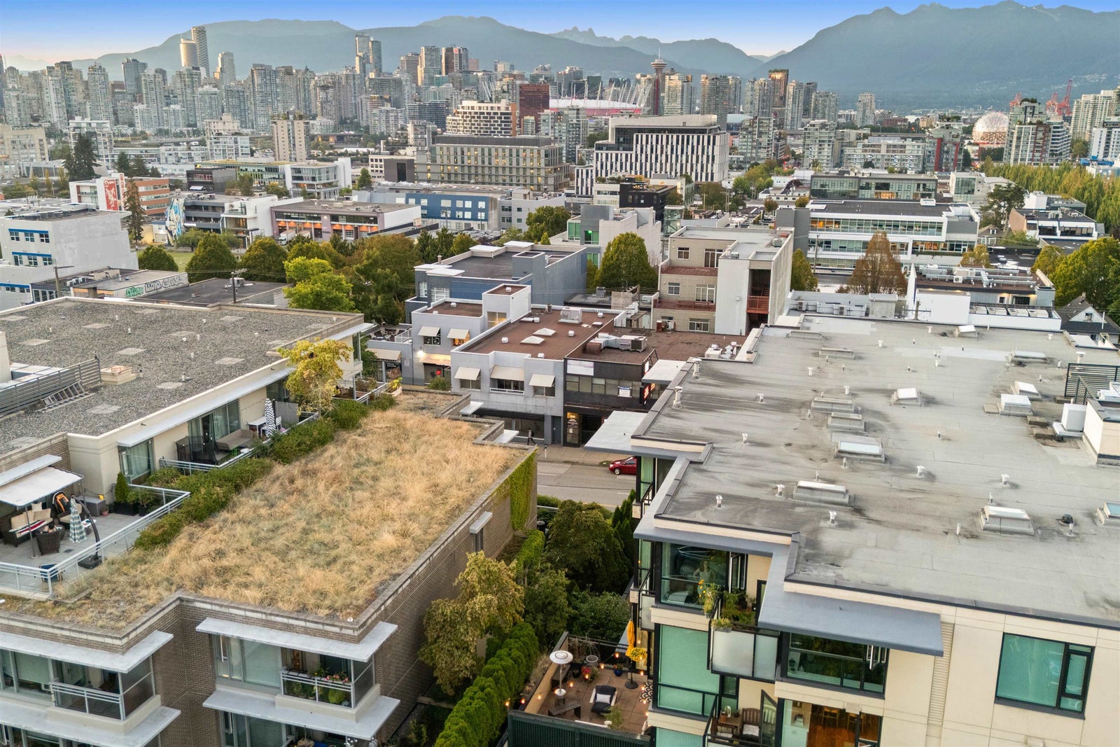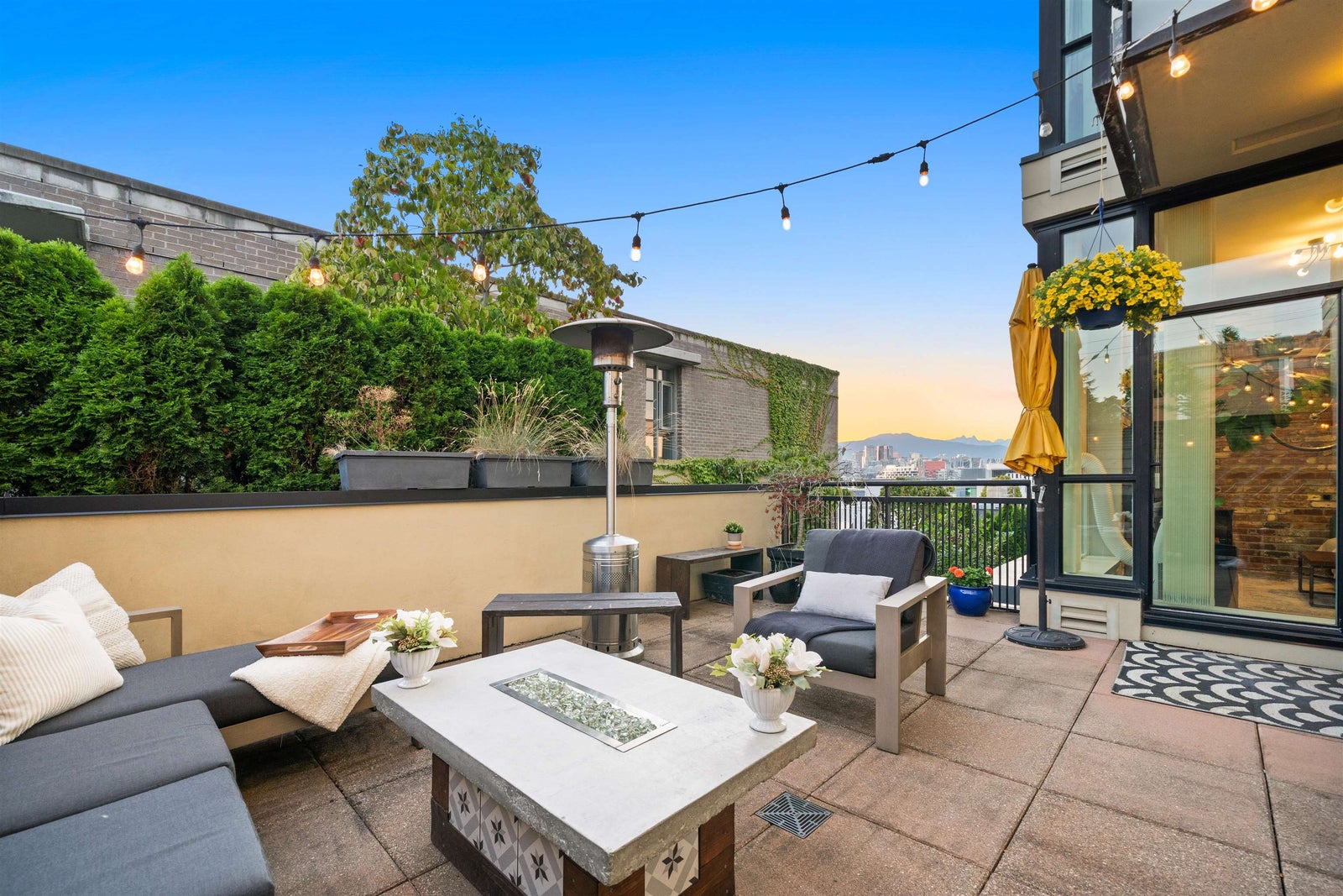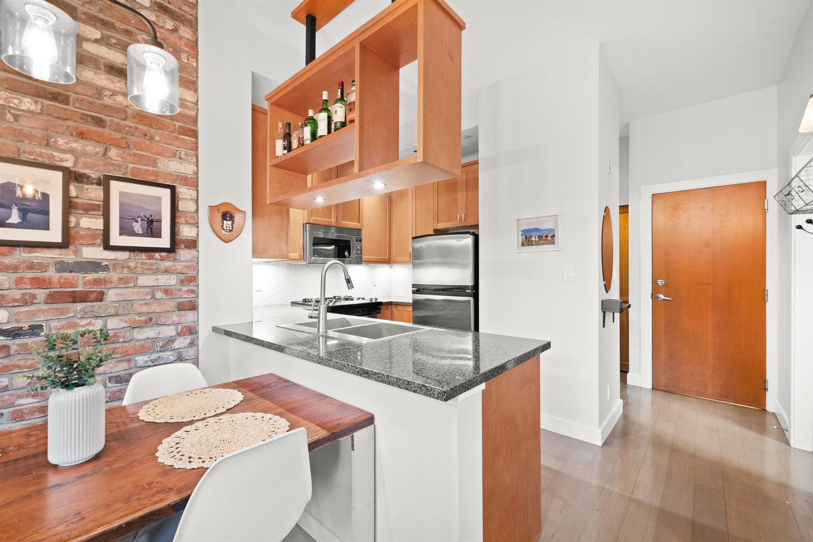 The Elements is a boutique concrete building in the heart of Mount Pleasant. This bright 1 bedroom and den home features 10 foot ceilings, hardwood floors, exposed brick, and a rare 300 square foot private patio with stunning city and mountain views. The layout is efficient with a spacious den, in-suite laundry, generous in-unit storage, and one secured parking stall. Just steps from cafes, transit, breweries, and Olympic Village. A perfect blend of character, solid construction, and lifestyle location.